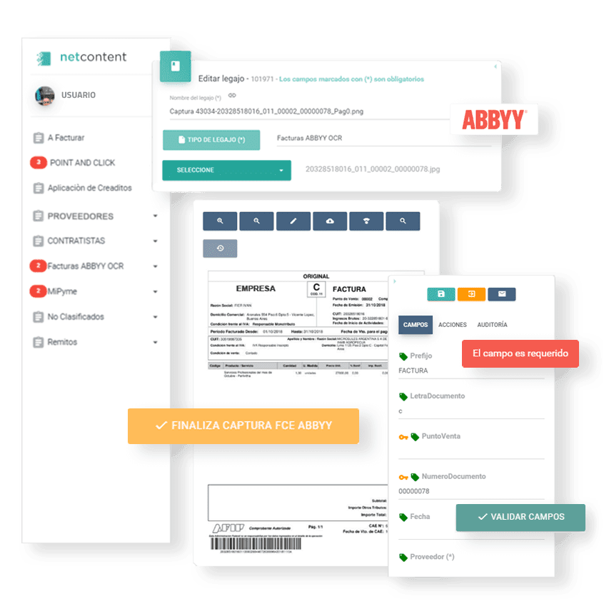 Netcontent utiliza el motor de ABBYY para reconocer campos indexables en documentos estructurados, lo que constituye un diferencial importante frente a otras soluciones; y en el caso de documentos no estructurados como contratos, la tecnología «Point & Click» permite capturar campos que de otra manera pasarían sin ser reconocidos.